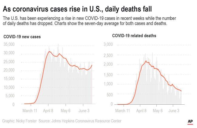 Experts note that a rise in deaths could take awhile to show up in the U.S. statistics. Stay-at-home orders imposed in March, combined with the use of face masks and other social-distancing measures, have been bringing down the daily death toll since mid-April, and the U.S. as a whole is still seeing the positive effects, even though people are starting to work, shop and eat out again.