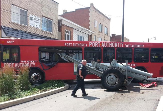 PITTSBURGH – Authorities say a bus hopped a curb and dislodged a war memorial cannon at a parklet in Pittsburgh.