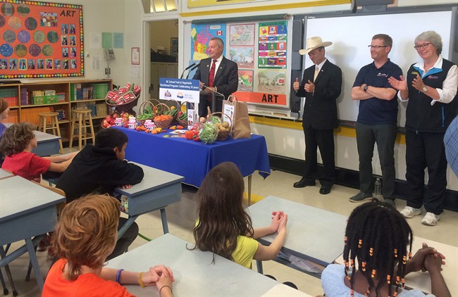 Terry Lake was at Oaklands Elementary School on Monday to mark a decade of the province’s fruit and vegetables program, which is available to 1,460 schools, or 90 per cent of B.C. schools.