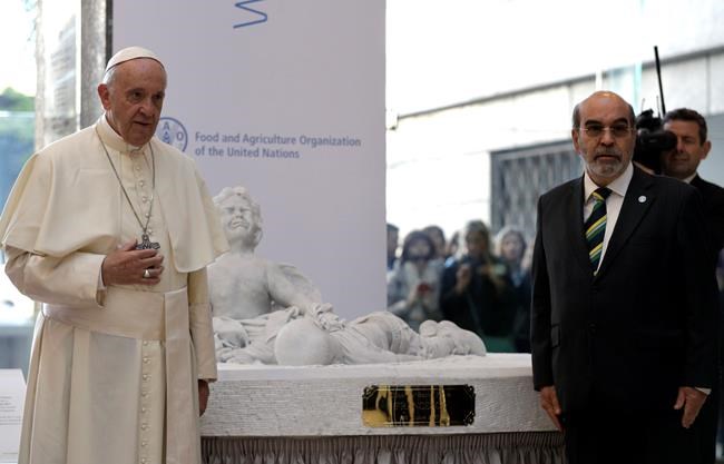 In a tangible sign of his message, Francis’ gift to the U.N. food agency to commemorate his visit was a marble sculpture of Aylan, the toddler who washed up on a Turkish beach in October 2015. The sculpture, which features a wailing angel over the little boy’s corpse, symbolizes the tragedy of migration, the Vatican said.
