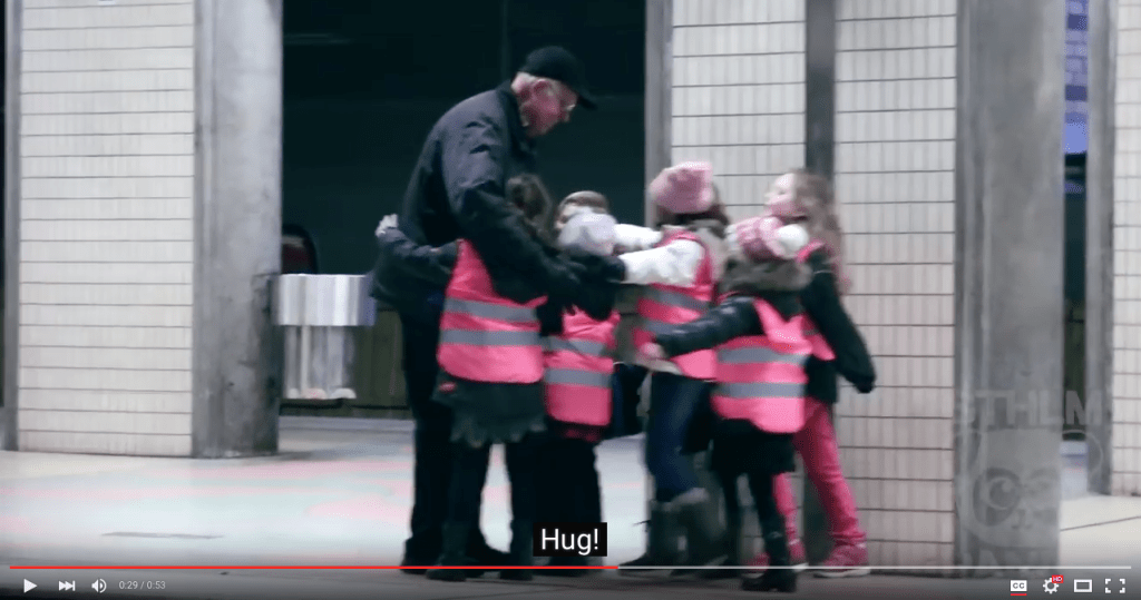 STHLM Panda from Sweden has posted a video of a group of adorable children surprising an elderly man at a train station with a song and a group hug.