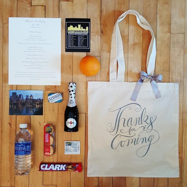 Pittsburgh-based wedding planner Natasha Brody of Hello Productions has designed postcards with a striking photo of Pittsburgh on one side and the wedding weekend itinerary printed on the back. She also likes to add some local favourites to the bag, like Clark bars or mini bottles of Heinz ketchup (both from Pittsburgh), or small bottles of locally distilled Wigle whiskey.