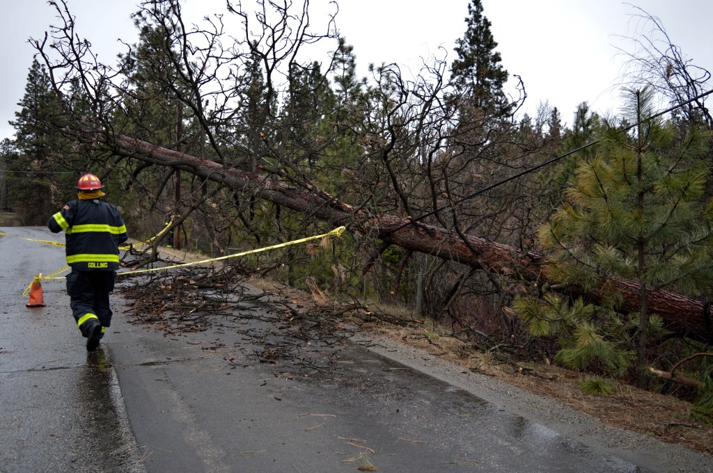 McCullough Road was closed yesterday afternoon as crews cleaned up a fallen tree, and power lines were knocked down on Spiers and Gulley Roads, according to a Global Okanagan report.