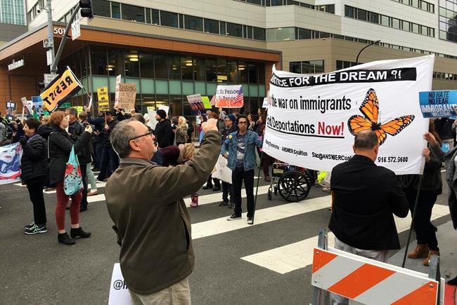 The protest Wednesday comes a day after Sessions announced the Trump administration is suing the state over several laws that restrict government authorities and private businesses from co-operating with federal immigration agents.