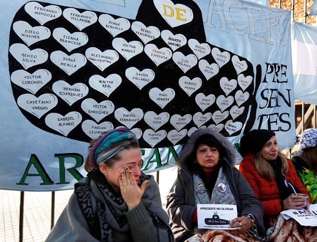 BUENOS AIRES, Argentina – Relatives of the 44 crewmembers who vanished with an Argentine submarine have chained themselves to the fence in front of the presidential offices to demand more efforts to locate the vessel.