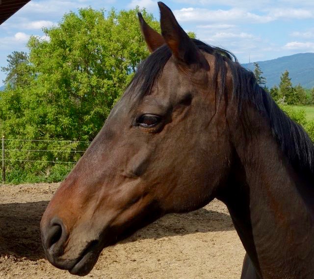 Cookie is a 16'1 dark bay 15-year-old thoroughbred mare.