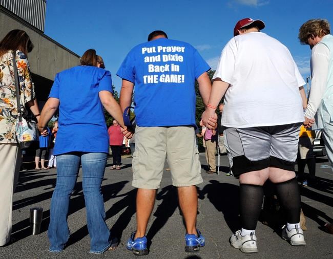 “I like ‘Dixie,’ but I’m here for prayer,” said Shane Alldredge, who attended the board meeting wearing a T-shirt that said “Put Dixie and prayer back in the game.”