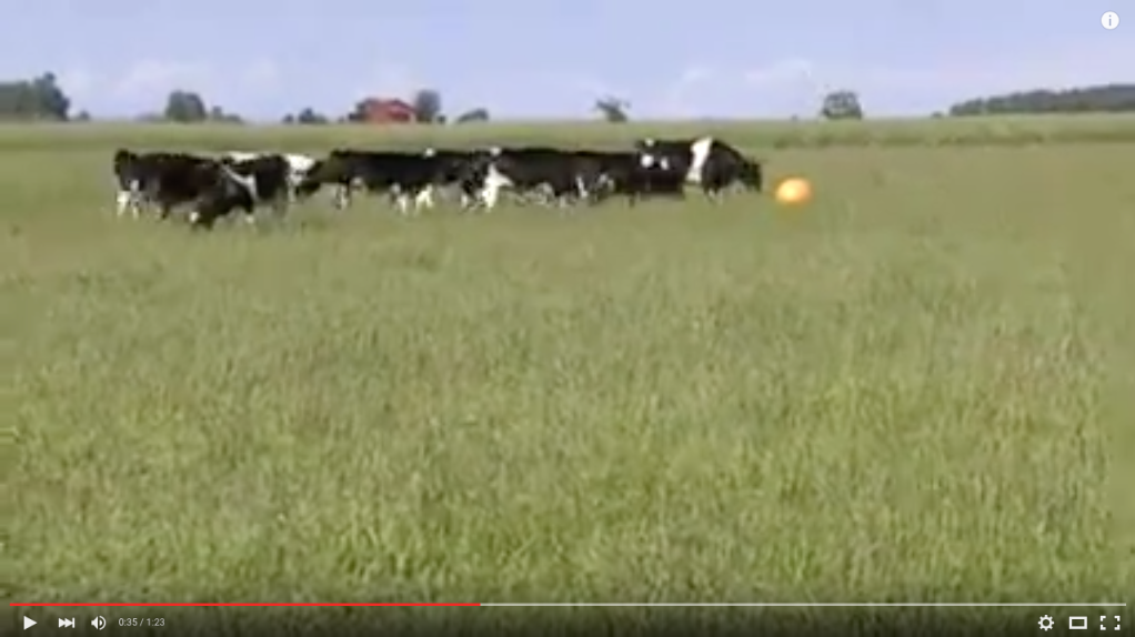 A farmer figured his cows needed something to do in the pasture besides eat and sleep, so he gave them a big, orange ball to play with it.