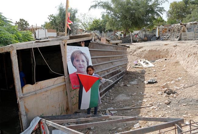 The pupils held posters of Merkel on Tuesday in Khan al-Ahmar, pleading with her to pressure Israel to halt demolition plans for the encampment of shacks near Jerusalem.