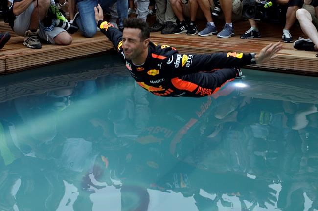 After guzzling champagne from his sweaty shoe — as he likes to do — it was time to cool off. The popular Australian swan-dived into the swimming pool located on the roof of Red Bull’s motorhome in Monaco’s glitzy harbour.