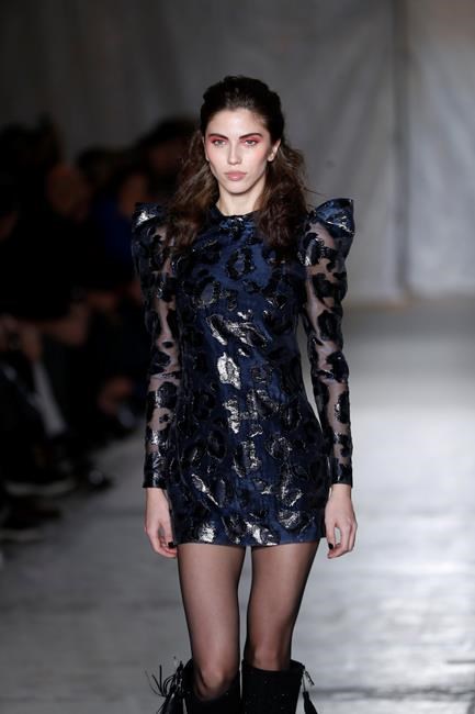 For women, a pretty sky-blue shirt cinched at the waist and featuring a sheepskin turtle neck was worn over a grey Bermuda-length skort. With cold weather in mind, the pair layered pants under skirts. One silver sequin skirt was worn over lightweight wide-legged trousers, with a lemon yellow Henley top.