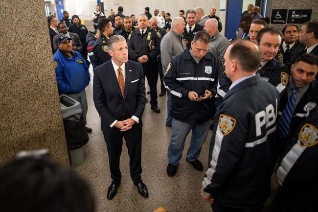 Earlier Monday, Lt. Jose Gautreaux, who was wounded at the 41st precinct, was greeted by lines of waiting officers as he left the hospital. His arm in a sling and a police jacket over his shoulders, Gautreaux got out of a wheelchair at the hospital entrance, walking to a waiting car and giving the crowd a thumbs-up. Among those there was NYPD Commissioner Dermot Shea.