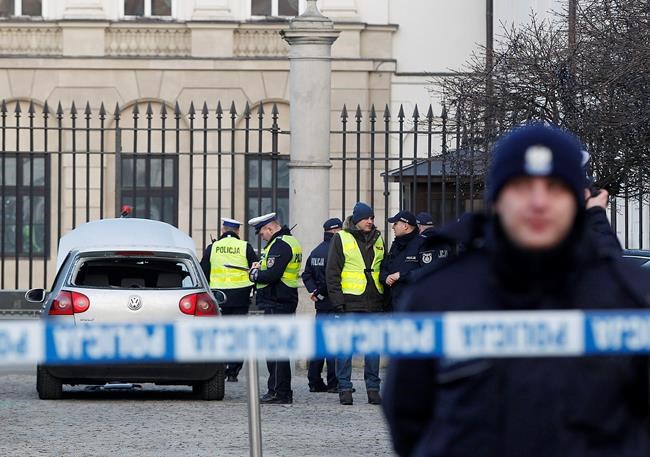 Police officers surrounded a silver Volkswagen car with a Warsaw license plate just in front of the gate to the palace Tuesday.