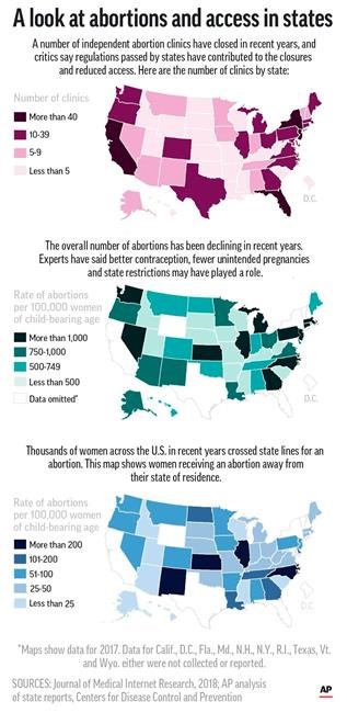 Nationwide, women who travelled from another state received at least 44,860 abortions in 2017, the most recent year available, according to the AP analysis of data from 41 states.
