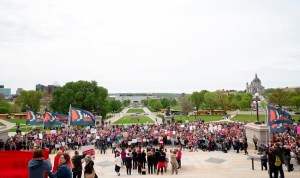 Roughly 75 activists opposed to the pipeline and the proposed tunnel visited Mackinac Island on Wednesday, walking near the entrance of the iconic Grand Hotel that is hosting the annual conference attended by business, political and other leaders.