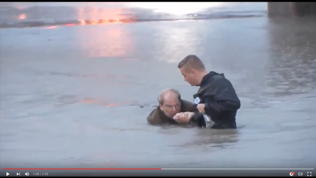 During the recent flooding in Houston, Texas, a man drove right into a flooded underpass while a TV crew was doing a live hit.