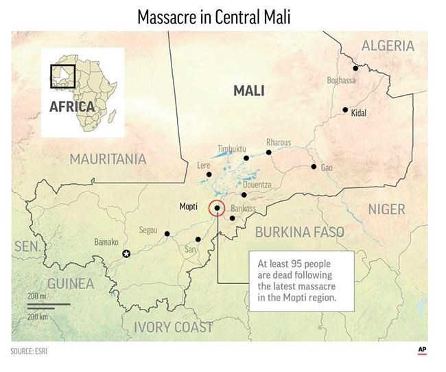 BAMAKO, Mali – Assailants raided a central Mali village early Monday, killing at least 95 people in the latest massacre in a growing ethnic conflict that has been enflamed by Islamic extremists, government officials said.