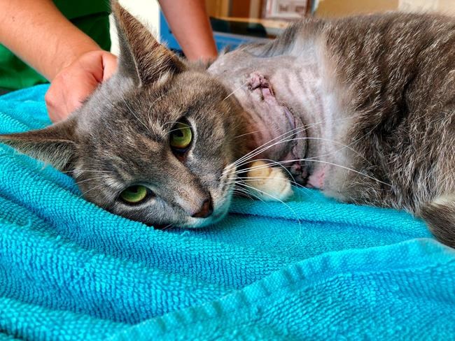 Humane Animal Rescue says on its Facebook page that two good Samaritans brought the cat in over the weekend after finding it limping around on the mangled, bloody leg.