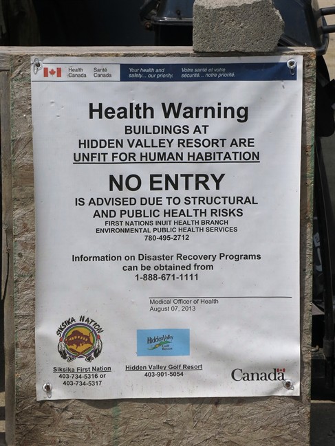 A sign by Health Canada warns “Buildings at Hidden Valley Resort are unfit for human habitation.”