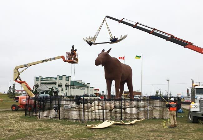 A crew of workers perched themselves high in a cherry picker and used ropes and a truck crane to carefully attach a new set of antlers on the roadside attraction in Moose Jaw, Sask., on Tuesday.