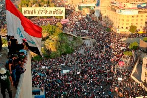 “I want change. I want to remove those corrupt people who sleep in the Green Zone and who fired tear gas and rubber bullets at us,” said protester Fares Mukhaled, 19, who sat barefoot on the ground at the square, where some had erected tents.
