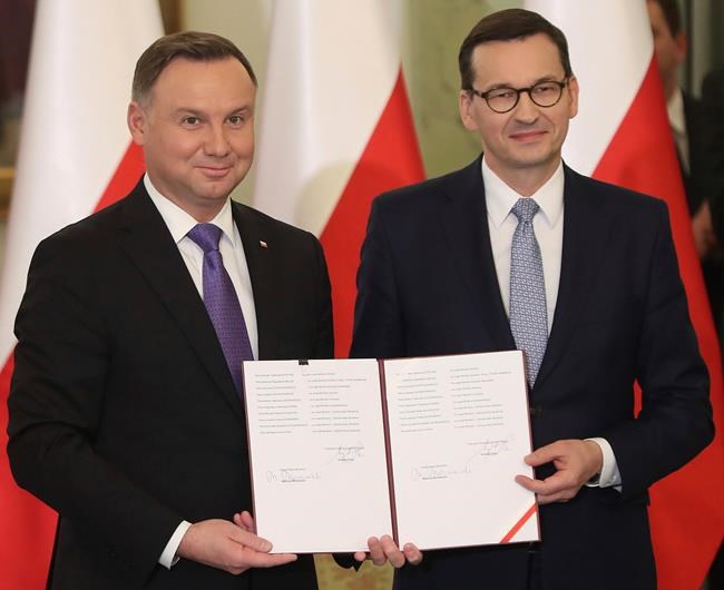 He stood at a news conference side-by-side with U.S. Ambassador Georgette Mosbacher to make the announcement. Polish experts on diplomacy said Duda violated diplomatic protocol, which dictates that heads of state do not appear as equals with ambassadors.