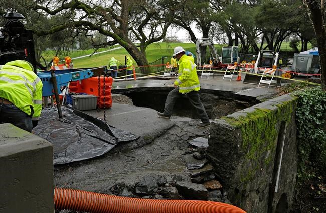 In suburban San Francisco, Orinda city officials declared a local state of emergency to secure funds to fix a giant sinkhole that opened in a road during previous heavy rain.