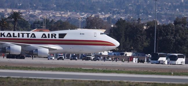The jet landed at the California base shortly after 8 a.m. A ground crew dressed in white approached the aircraft, and three charter-style buses parked near the plane. About 40 minutes after landing, people could be seen walking from the plane to the first bus, which then departed. Another bus pulled up next to the plane’s baggage compartment.