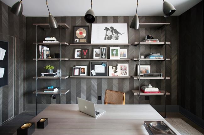 For one client who had a collection of music memorabilia, Gerson added built-in shelving in a home office to display the collection in an organized way that pleased both partners.