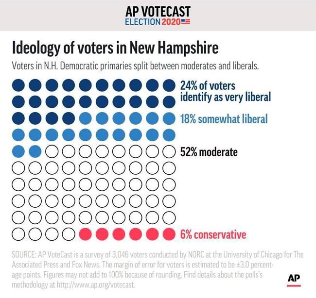 AP VoteCast is a survey of the American electorate conducted by NORC at the University of Chicago for The Associated Press and Fox News. The survey of 3,111 voters in New Hampshire was conducted for seven days, concluding as polls closed. Interviews were conducted in English or Spanish. The survey is based on interviews with a random sample of registered voters drawn from the state voter file. The margin of sampling error for voters is estimated to be plus or minus 3.0 percentage points.