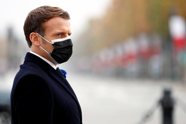 Several military figures wore blue masks decorated with blue cornflowers, France’s symbol of World War I. Macron wore a cornflower pin on his lapel and a black mask.