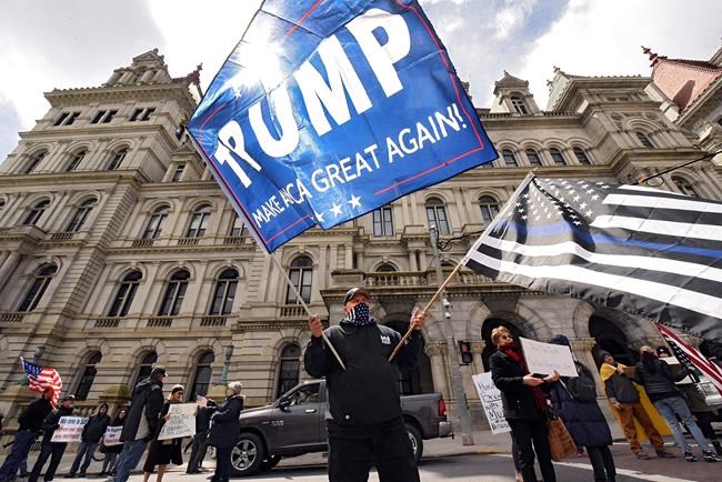 Several dozen protesters outside the state capitol waved signs calling on Cuomo to lift social distancing restrictions as a cavalcade of horn-honking, flag-bedecked cars and pickup trucks slowly circled the block to snarl noontime traffic.