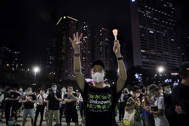 Despite the police ban, crowds poured into Victoria Park to light candles and observe a minute of silence at 8:09 p.m. (1209 GMT, 8:09 a.m. EDT). Many chanted “Democracy now”and “Stand for freedom, stand with Hong Kong.”