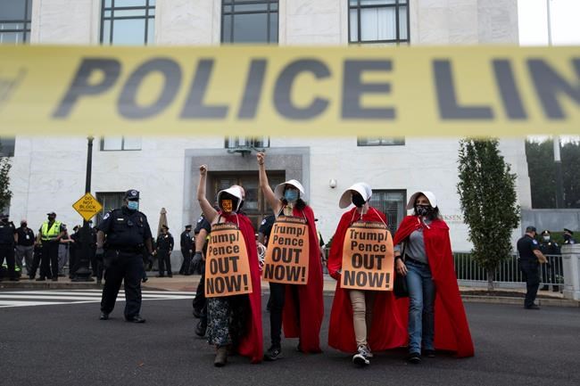 As the Senate committee met, protesters, some shouting “Stop the confirmation!” demonstrated outside the Capitol across the street from the Supreme Court. Some dressed as handmaids, a reference to Barrett’s role in a conservative religious group that once called high-ranking women members “handmaids.” Other demonstrators had “#SupportAmy” signs.
