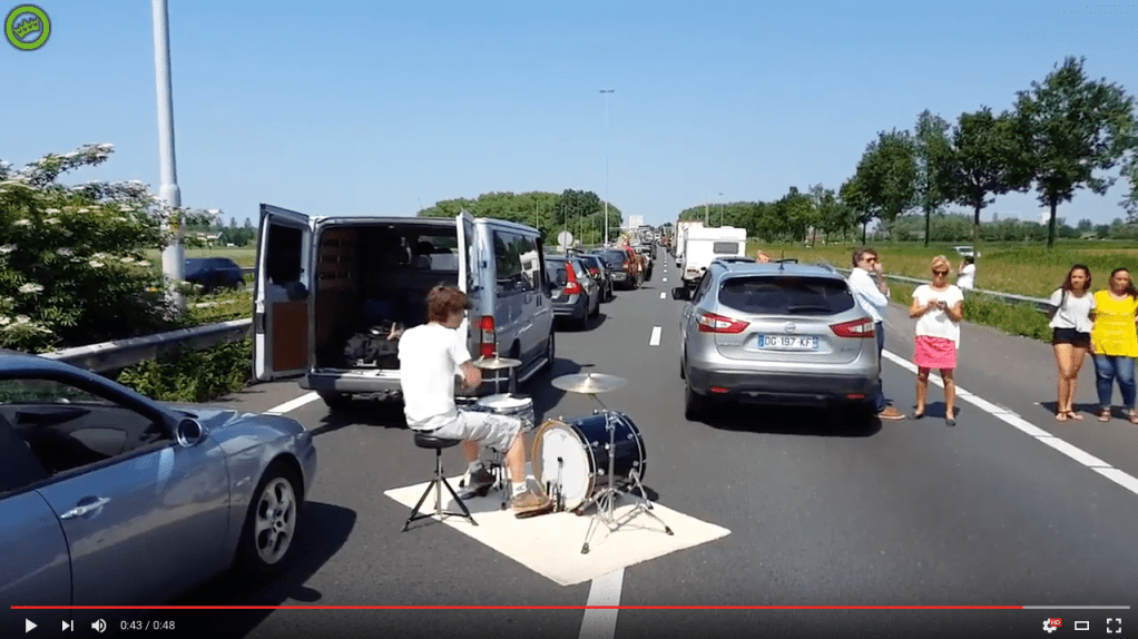 Stuck in traffic? Why not pull out a drum kit and serenade your fellow travellers.