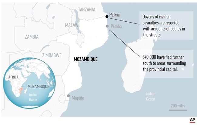 JOHANNESBURG – Rebels fought the Mozambican army Sunday for the fifth straight day for control of the strategic northern town of Palma, as reports came in that dozens of civilians have been killed and bodies were littering the streets. The fate of scores of foreign energy workers was also unknown.