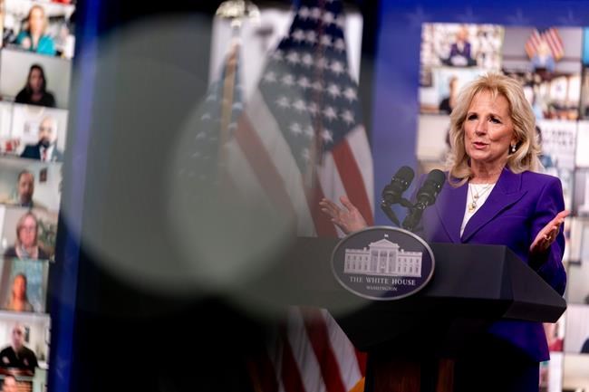 The first lady was joined virtually Wednesday by military families, advocates and others from around the world, a total of more than 100 people appearing in individual boxes on screens behind her on the stage at the White House.