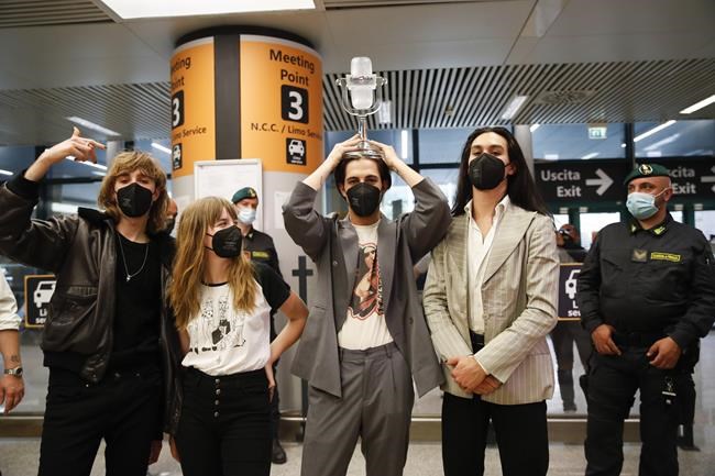 ROME (AP) — The Italian glam rock band that won the Eurovision Song Contest returned home Sunday to the adulation of fans, congratulations from the government and so much speculation that the lead singer had snorted cocaine during the show that he vowed to take a drug test.