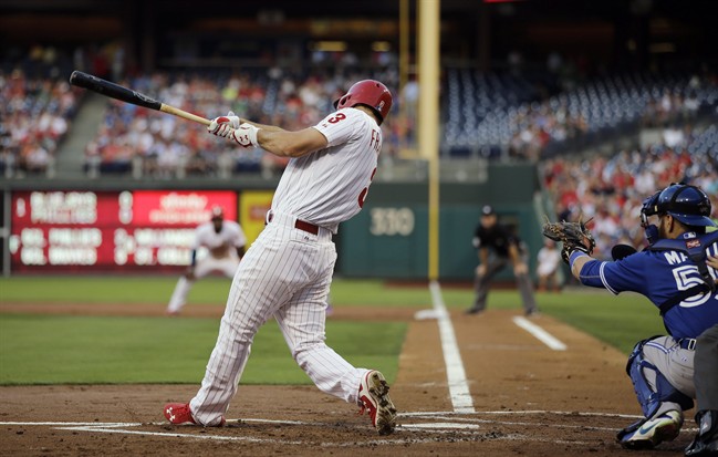 The Phillies jumped on Buehrle for three runs in the first on Francoeur’s sacrifice fly, Darin Ruf’s RBI single and a run-scoring double by Altherr. It was the first career hit for the 24-year-old Altherr, a 2009 ninth-round draft pick who was called up to fill the roster spot of Maikel Franco after the rookie third baseman was placed on the disabled list on Tuesday with a fractured left wrist.