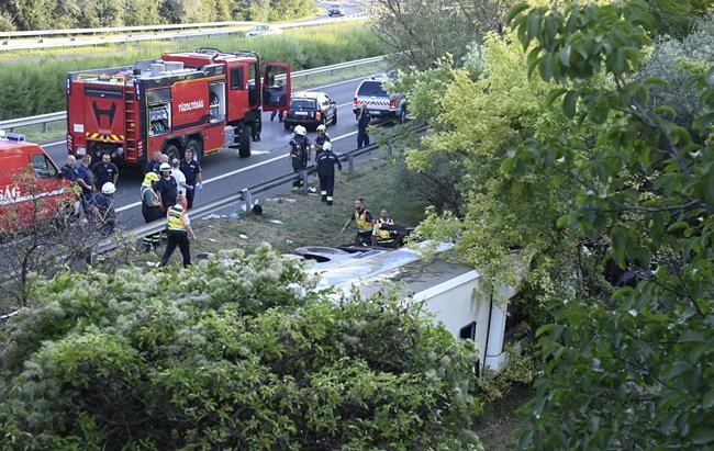 BUDAPEST, Hungary (AP) — A bus traveling on a highway in Hungary crashed through a guardrail and tipped over early Sunday, killing at least eight people and injuring dozens, police said.