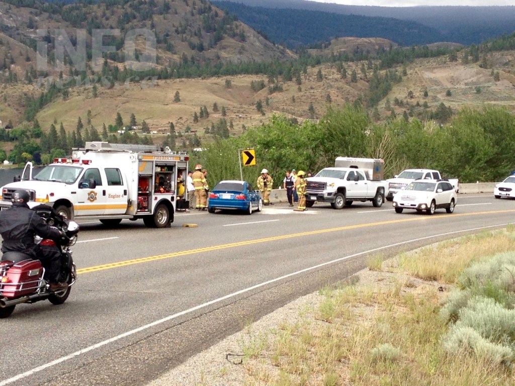 The driver appears to have lost control on a sharp curve on Highway 97 about a kilometre north of Okanagan Falls near Old Kaleden Road this afternoon, June 13, slamming the car into the a concrete barrier.
