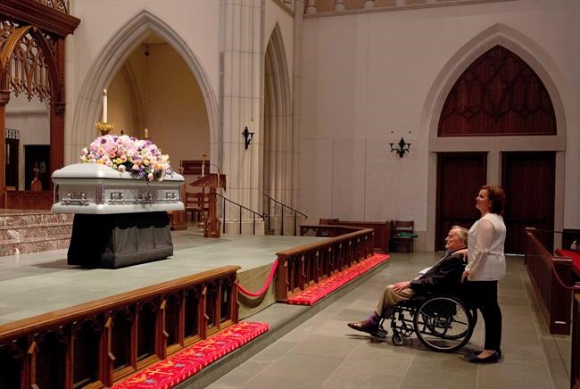 The nation’s 41st president was seated in a chair a few feet away from the rose-covered casket Friday at St. Martin’s Episcopal Church in Houston. He and his wife, Barbara, had long worshipped at the church.