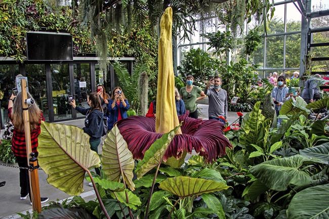 ENCINITAS, Calif. (AP) — The bloom of a giant and stinky Sumatran flower nicknamed the “corpse plant” because it smells like a dead body is drawing huge crowds to a Southern California botanical garden.