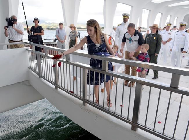 Haerry’s granddaughter, Jessica Marino, travelled from New Jersey to Hawaii with her family for Saturday’s ceremony. She handed his urn to divers, who placed it within the ship’s sunken hull. Hundreds of sailors and Marines are entombed there.