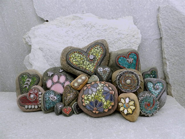 Recently, she began balancing her usual large projects with smaller ones: She turns her mosaic touch to smooth stones that she picks up on beachcombing and mountain hikes near her Huntington Beach, California, home.