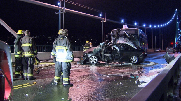 The bridge was closed at about 11:45 p.m. Wednesday when a northbound car lost control and slammed into an oncoming West Vancouver Transit bus, and a third car piled into the wreck.