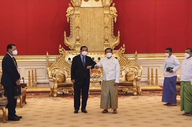 Photos posted by a military-related publication, the Popular News Journal, showed Min Aung Hlaing and Hun Sen standing side by side in face masks, bumping forearms and seated on ornate gilt chairs before an elaborate golden screen.
