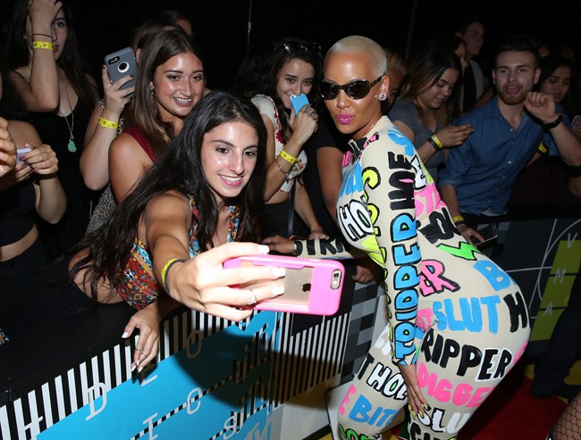 As “fun” as Swift and Cyrus were at the Microsoft Theater in Los Angeles, Amber Rose was more “political” with a posse of her own. All were adorned in slogans that included “gold digger,” ”whore,” ”stripper” and stronger, unprintable slurs for women and gay men.