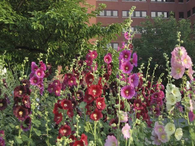 Pink, purple, peach, red, white, yellow or near-black flowers completely cover 8-foot stalks from top to bottom. The large-leaved plants are biennial, which means they live for two years and bloom only in their second year, but they do self-seed, so there will always be more on deck. Plant them in full sun in the north and part shade in hot climates, and provide a fence, trellis or stake for support.
