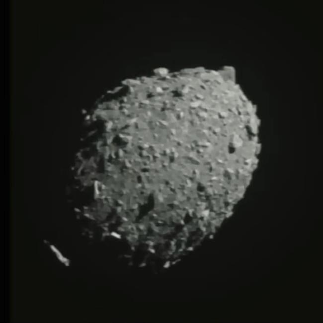With an image beaming back to Earth every second, Adams and other ground controllers in Laurel, Maryland, watched with growing excitement as Dimorphos loomed larger and larger in the field of view alongside its bigger companion. Within minutes, Dimorphos was alone in the pictures; it looked like a giant gray lemon, but with boulders and rubble on the surface. The last image froze on the screen as the radio transmission ended.